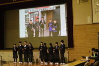 伝えました。最後に全校生徒で記念写真撮影を行い、選手たちにエールを送りました。